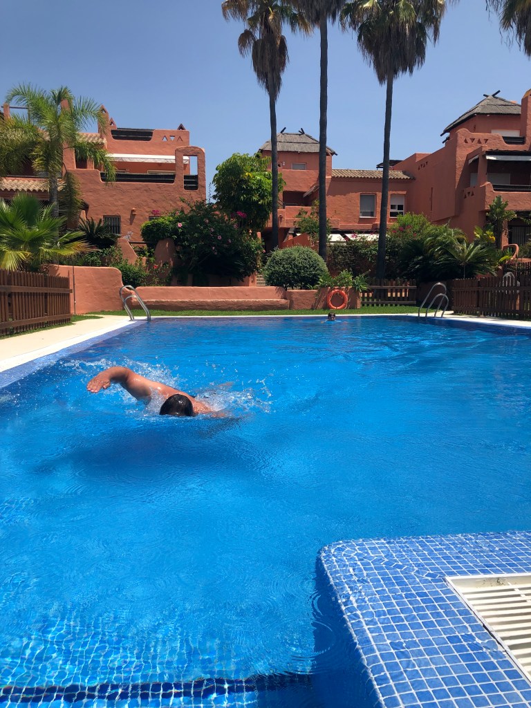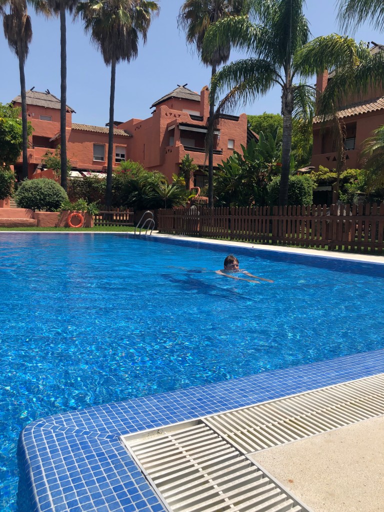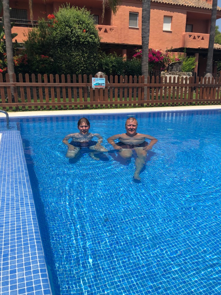 Am Montag werden auch um die 40 Grad. Das ist selbst mir zu heiß. Andreas fährt mit dem Vito zur Arbeit. Ich gehe fast nicht aus der Wohnung. Abends trauen wir uns dann doch raus in der Carrefour und kaufen uns zwei Strandstühle, einen roten und einen blauen. 🙂 Dienstags habe ich immer Saxophon mit Nele. Das klappt gut, ich versuche jetzt ca.1 Stunde pro Tag zu üben. Beim Ausflug zum Atlantik verbrennen mir fast meine Füße im Sand, schon sehr heiß hier. Der Atlantik ist eine willkommene Erfrischung. Meine mir selbst gestellte Aufgabe für heute war, in der Gaststätte 2 Plätze in der Stadt zu bestellen. Ich traue mich sogar mehrmals anzurufen, erreiche aber niemanden. Andreas schlägt dann vor, in Vistahermosa zu essen. Wir sitzen dort sehr nett und treffen dann noch Volker (Andreas Kollegen) mit Tochter. Es ist ein sehr schöner, lustiger und interessanter Abend. Mittwoch bin ich viel mit dem Putzen der Wohnung beschäftigt. Loli, unsere Spanischlehrerin, kommt wieder. Da wir auch das Verb putzen deklinieren mussten, nutze ich gleich die Möglichkeit Loli nach einer Putzhilfe zu fragen. Sie schreibt sich meine WhatsApp Nummer auf. Ich hoffe, sie kann mir helfen. Im Unterricht ruft auch noch Daniel an, lustig. Abends gehen wir am Strand spazieren. Das gefällt mir immer sehr. Am Donnerstag hole ich endlich mal wieder Andreas von der Arbeit mit dem Fahrrad ab, wir fahren wieder über den Strand zurück und beobachten, wie jemand einen Rochen an der Angel hat, ihn dann aber nach einigen Fotoposen doch wieder in den Atlantik entlässt. Wie telefonieren viel mit Christoph und Daniel, schön. Freitag stehe ich mit dem Wecker auf. Daniel kommt nach El Puerto, toll. Ich hole ihn vom Flughafen ab und freue mich, ihn mal wieder drücken zu können. Schön, wir haben jetzt eine Woche zusammen in El Puerto. Es geht gleich erstmal in den Pool, dann grillen wir schön zu dritt. Das Wochenende wird anfangs ein bisschen holprig. Wie Daniel so schön sagt: „Mutti will immer durch die Gegend jachten, mir würde auch einfach am Strand baden und dann im Poll baden reichen.“, werden wir uns erst nicht einig, was wir tun wollen. Wir kaufen dann erstmal einen Fahrradhelm für Daniel (im 2. Fahrradladen werden wir fündig) und wollen dann eine neue Gaststätte in unserer Nähe ausprobieren. Diese ist allerdings nur für große Feiern gedacht. Andreas führt uns zum Shamrock (Irisches Restaurant), dort ist es sehr lecker. Den Rest des Tages verbringen wir mit Baden im Atlantik und im Pool und mit Star Wars als Animationsfilm. Am Sonntag wollten wir ins Castillo nach El Puerto. Auch am Schloss stand, dass die Öffnungszeiten täglich von 10-20 Uhr sind. Wir standen aber vor verschlossener Tür. Somit war wieder Pool und Atlantik angesagt, diesmal haben wir unsere neuen Stühle mit Sonnenschirm eingeweiht.