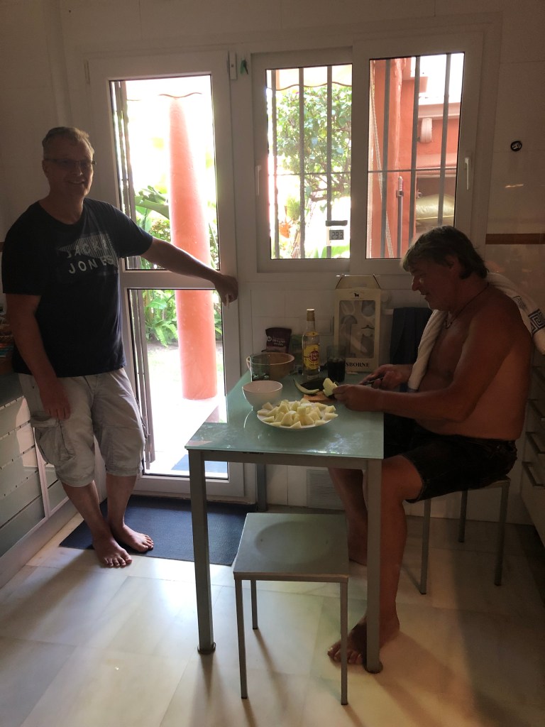 Nach dem Frühstück im Hotel machen wir uns wieder auf den Weg nach El Puerto. Andreas geht am Nachmittag noch arbeiten und ich putze die Wohnung und räume den Bus aus. Freitag früh gegen 6 Uhr ruft Steffen an. Er ist die Nacht durchgefahren und nun wohlbehalten bei uns angekommen. Nach einem Willkommensbier für Steffen und Frühstück für Andreas, fährt Andreas zur Arbeit und Steffen und ich nicken nochmal über. Gegen 12 Uhr gibt es im Vorgarten Frühstück.
