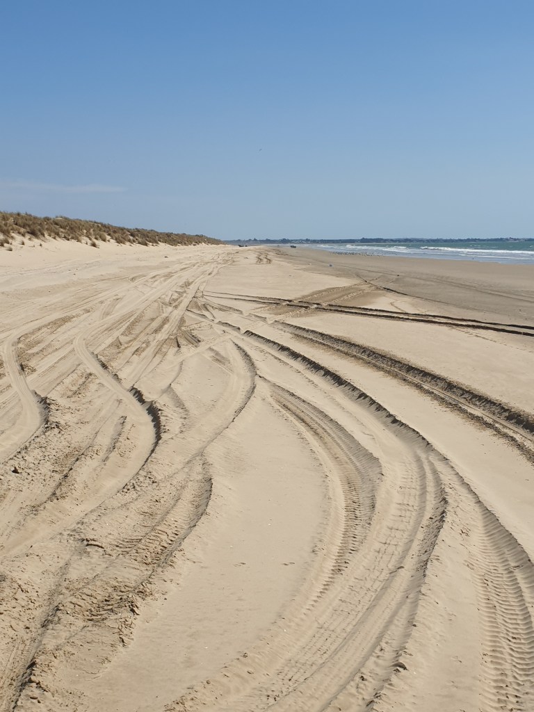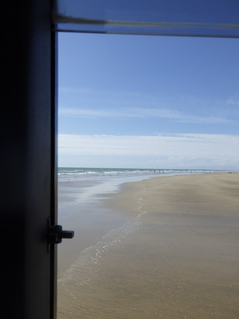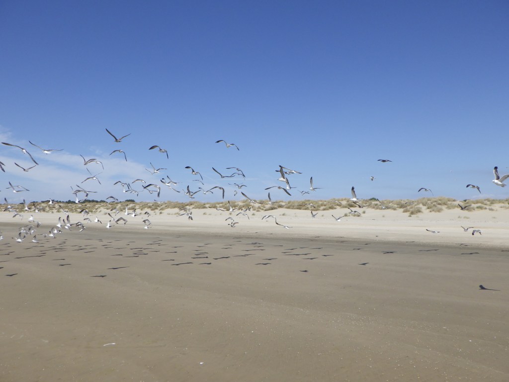 Da wir uns bei der Planung der Radtour am Strand nach den Gezeiten richten müssen, war Sonntagvormittag Zeit, sich um die Sattelitenanlage zu kümmern. Nach einer Stunde Probieren von Andreas und Udo stellte sich heraus, dass die Ausrichtungsangaben aus Internet und App falsch waren. Mit etwas Probieren hatten sie dann Empfang, mussten dann aber feststellen, dass eine Montage an der geplanten Stelle nicht möglich war. Nach einer Stunde weiteren Versuchens haben sie dann eine provisorische Befestigung am Abluftschaft des Schornsteins gebastelt. So konnten wir gerade noch pünktlich zur Übertragung der Basket-Weltmeisterschaft den Fernseher in Betrieb nehmen. Dörte und ich haben die Zeit genutzt und waren am Strand.