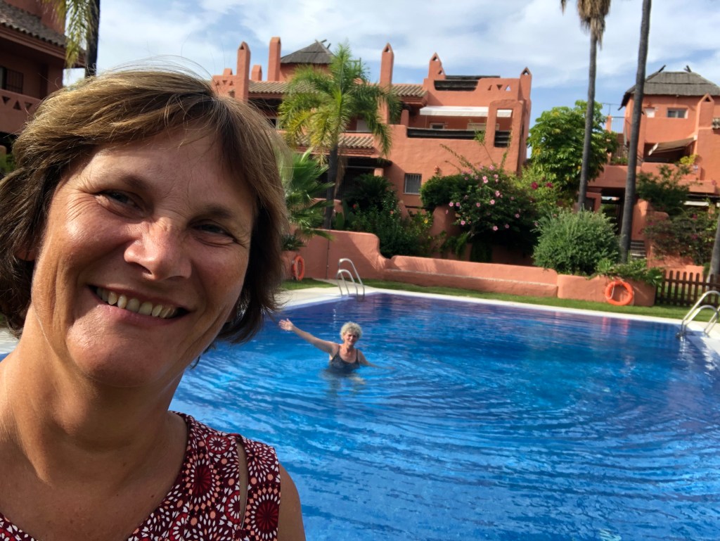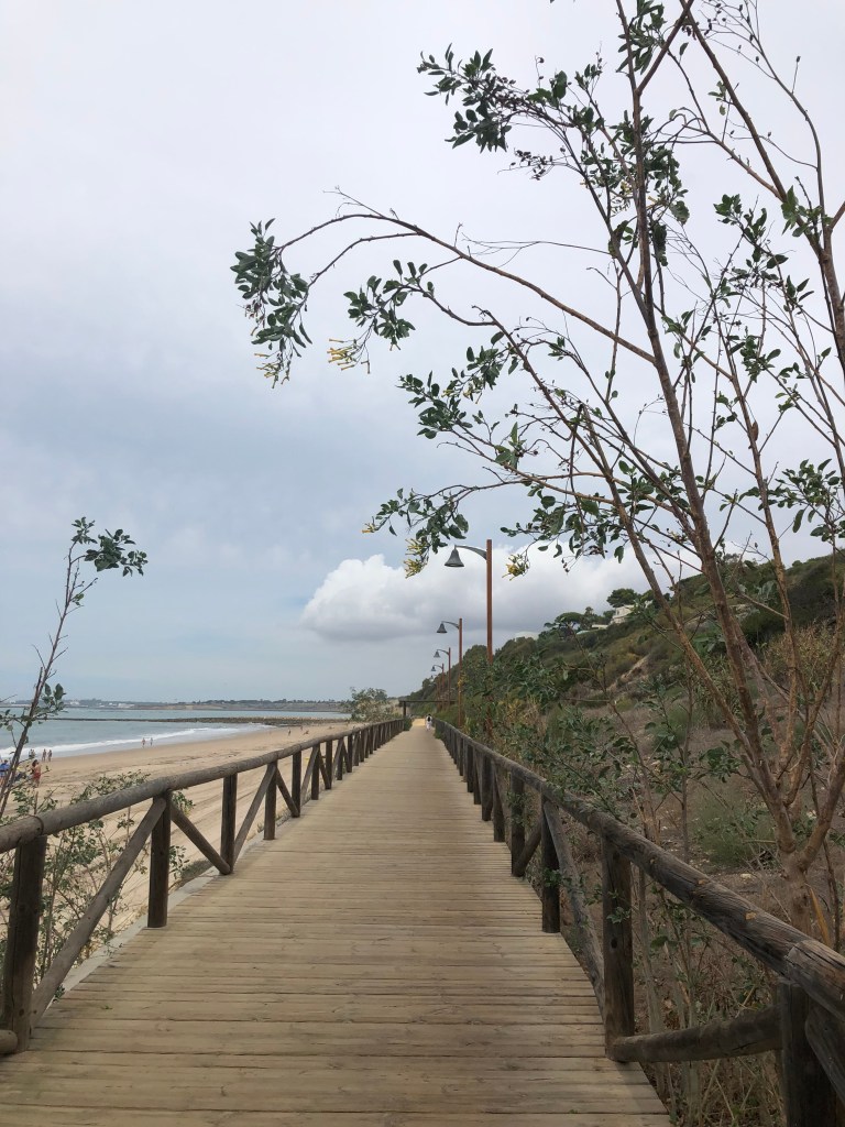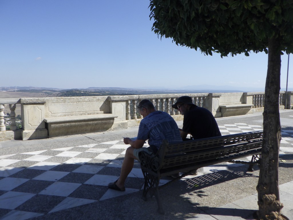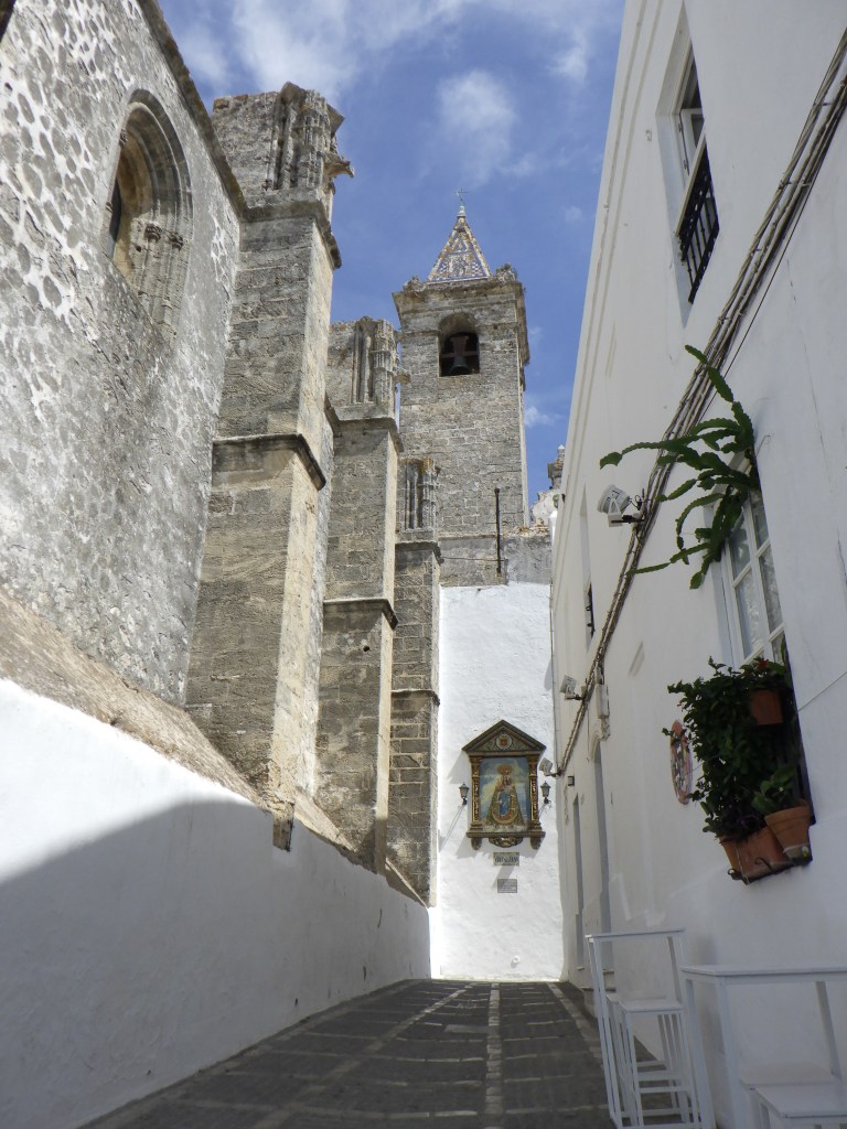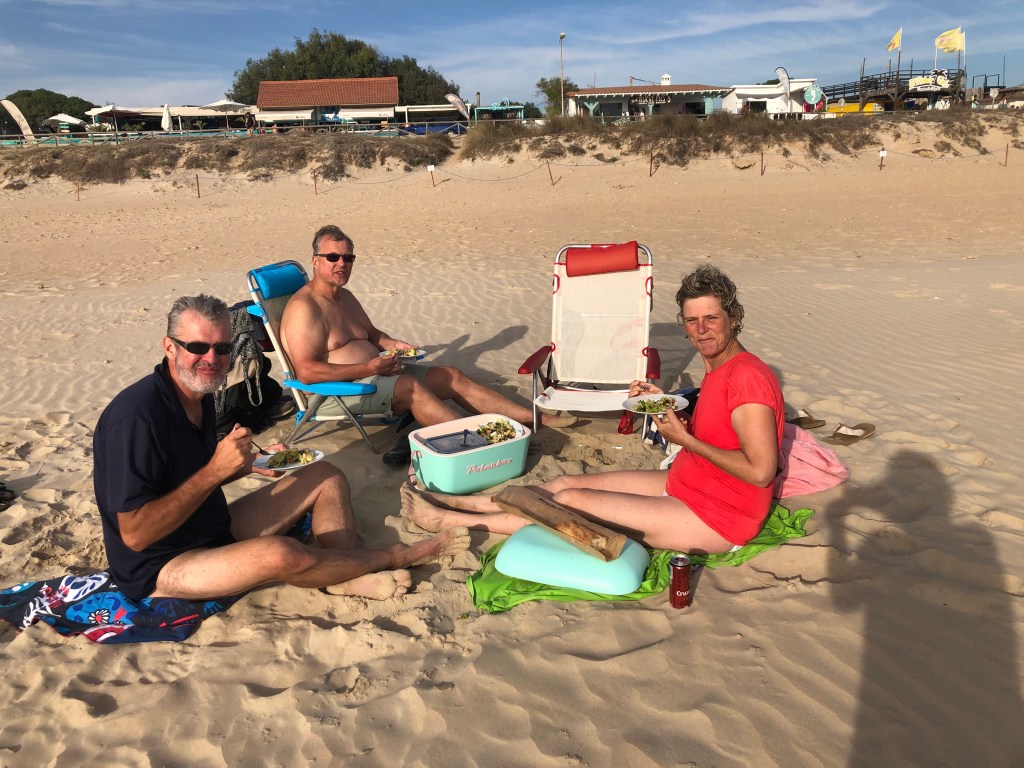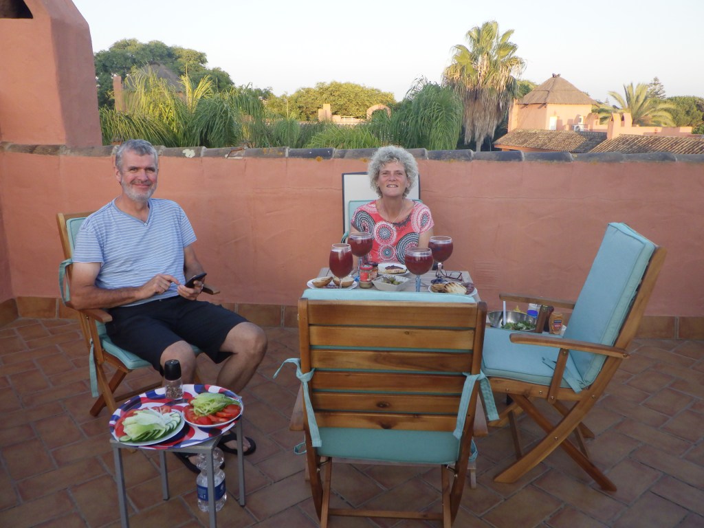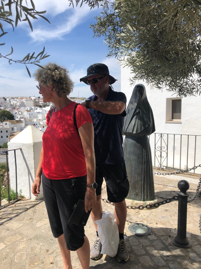 Am Freitag hat Andreas endlich auch frei. Nach dem Frühstück um 9 Uhr geht’s nach Vejer de la Frontera. Am Parkplatz gibt es eine kleine Diskussion, ob wir erst wandern und dann in die Stadt gehen oder anders herum. Wir gehen erst in die Stadt und sind alle total begeistert. Es ist sehr schön. Wir verstehen, warum sie als schönste weiße Stadt gilt. Dörte kauft sich eine schicke Umhängetasche und endlich finden wir auch mal Keramik, die uns gefällt. Wir kaufen Schüsseln und Platten und müssen uns dann erstmal in der nächsten Gaststätte stärken. Die Straßen und Gassen sind wirklich hübsch. Unser Wanderweg stellt sich leider als Straße heraus, wir wandern trotzdem um die 8 km. Danach fahren wir nach El Palmar, gucken an der Gaststätte vorbei, in der ich im vorigen Jahr nach dem Surfen mit Daniel war und suchen einen Parkplatz. Es ist noch ziemlich voll. Gut ausgerüstet mit Stühlen, Schirm und Polarbox bauen wir unseren Rastplatz am Strand auf und es geht in den Atlantik. Danach lassen wir uns die Reste der Salate (Kartoffel und Gemüse) von gestern Abend schmecken. Dörte und ich sind total glücklich. Unsere beiden Männer gucken manchmal ein bisschen spitz, wenn mal wieder ein Sandkorn auf dem Salatblatt gelandet ist. Aber irgendwann sind wir alle zufrieden und genießen den Sonnenuntergang. Es wurde auch nach der Musik aus den Bars getanzt. Ein schöner Abend. Zu Hause gibt es natürlich noch „Tinto Verano con Naranja“. Wir stellen fest, dass keiner so gut schmeckt, wie bei uns auf der Terrasse.