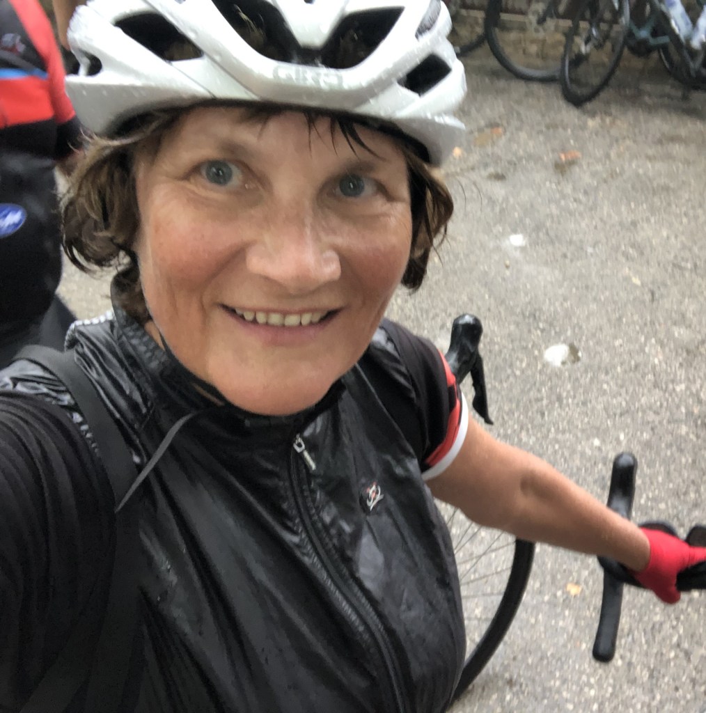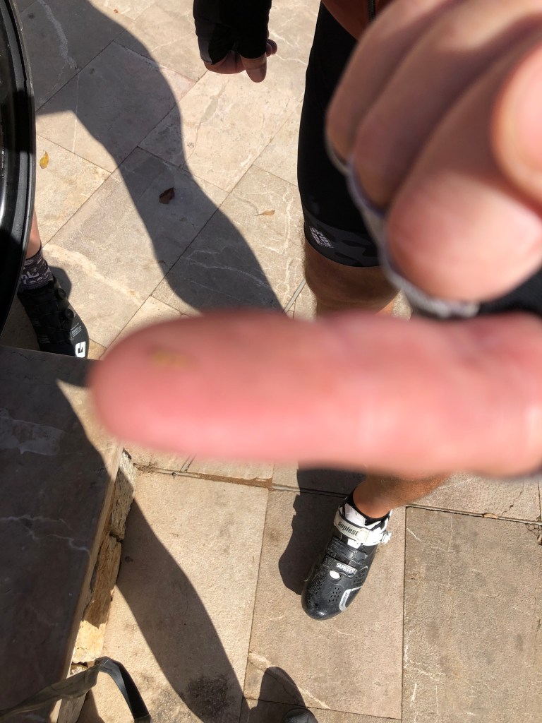 Dienstag fahren wir beide in Dieters Gruppe. Da wir gestern klischnass geworden sind, ist meine Fahrradhose nicht trocken geworden, obwohl wir unsere Sachen ständig geföhnt haben. Ich habe meine einfache Radhose an, darin schwitzt man sehr. Dieter fährt als erstes in die Bikefriends-Station nach Alcudia. Diese erkenne ich sofort wieder, hier war ich mit Dörte im vorigen Jahr zum Fahrrad und Proviant holen. Ich ergreife meine Chance und frage, ob man auch was im Shop kaufen könnte. Dieter schliesst den Shop auf und guckt nach einer Radhose. Leider sind mir alle zu klein. Wir fahren weiter und Dieter hält im großen Bikefriends-Shop am Ausgang von Alcudia an. Es gibt nur die Borathose aus der vorigen Saison, die ich eigentlich nicht möchte. Ich probiere sie dann doch, beginnend mit Größe M und muss noch drei weitere größere Radhosen probieren, bevor sie passt. Die spanischen Größen schmeicheln wirklich nicht. Dieter macht Qualitätskontrolle und Andreas kauft die Hose. Toll, ich behalte sie gleich an. Schön, dass die Gruppe ohne zu Murren draußen gewartet hat. Mit der neuen Hose fährt es sich gleich viel besser. Ich fahre viel auf der zweiten Position hinter Dieter. Das geht wirklich ganz gut. Wir machen wieder in Sineu zum Kaffee Halt. Gestern durfte ich den Mandelkuchen noch als glutenfreien Kuchen essen, heute hat die Bäckerin ihn mir nicht verkauft. Auf der Rücktour hat Dieter einen Platten. Es ist nicht nur der Schlauch, sondern der Reifen ist komplett defekt. Wir fahren ohne Guide ins Hotel, Andreas übernimmt die Führung und bringt uns gut zurück.